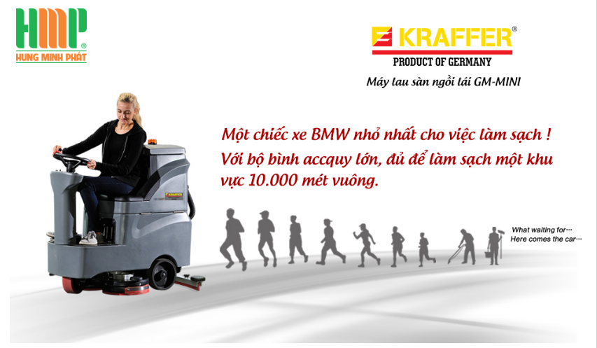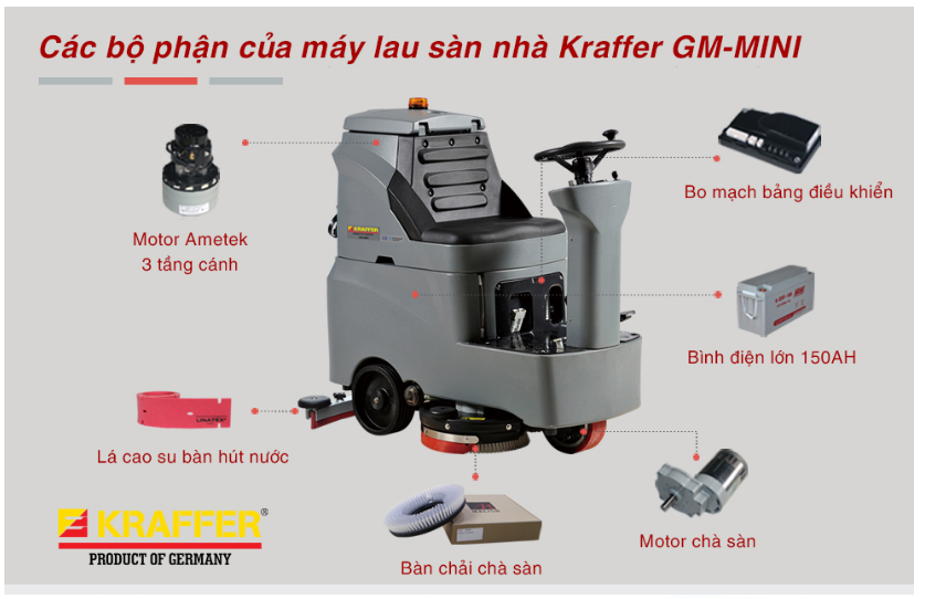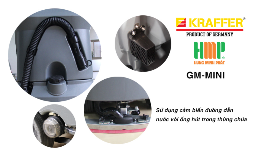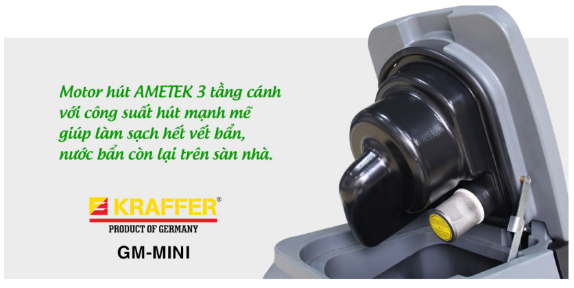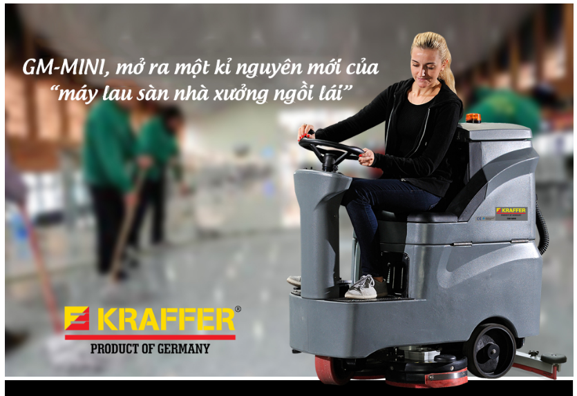 Máy chà sàn ngồi lái Kraffer GM-MINI được thiết kế và vận hàng kết hợp giữa tính năng vừa chà sàn và hút nước (bẩn) cùng nhau. Phù hợp cho nhà xưởng, bệnh viện, trung tâm thương mại… Máy sử dụng 2 bàn chải chà sàn, cho công suất lau nhà nhanh gấp 2 lần các máy khác. Kraffer GM-MINI dùng motor tợ lực giúp cho người dùng làm việc nhẹ nhàng.