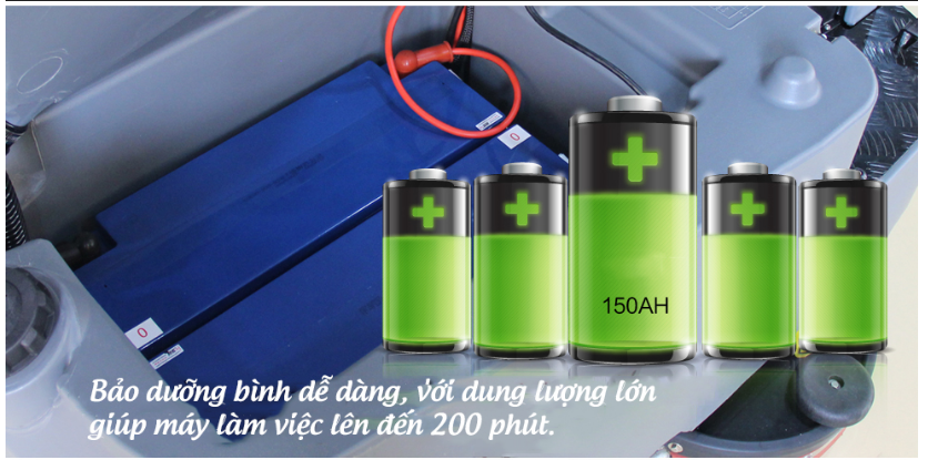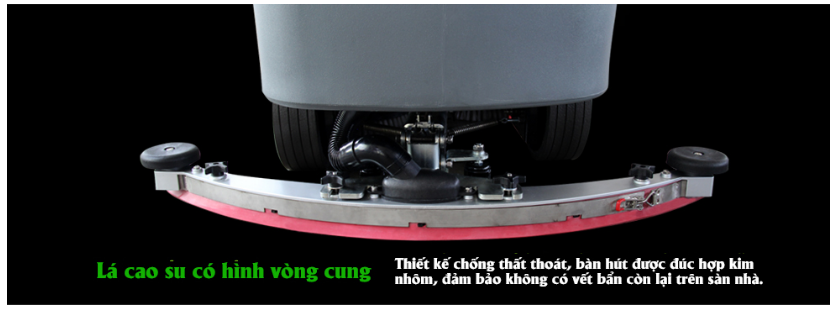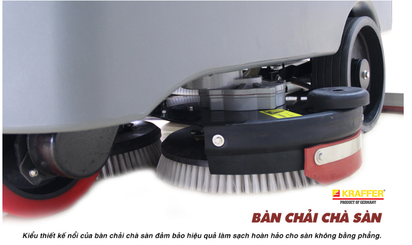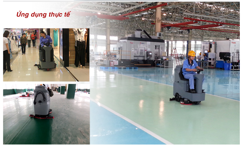 Bàn chải, bàn hút có thể khởi động làm việc trong cùng một lúc để lau sàn nhà sạch như mới. Nước bẩn, đất, cát, dầu, tất cả được hút vào thùng chứa nước thải. Máy lau sàn có thể làm sạch bề mặt các chất liệu khác nhau và môi trường xung quanh sàn khác nhau, ví dụ: sàn epoxy, bề mặt sơn, bê tông, đất gạch,…