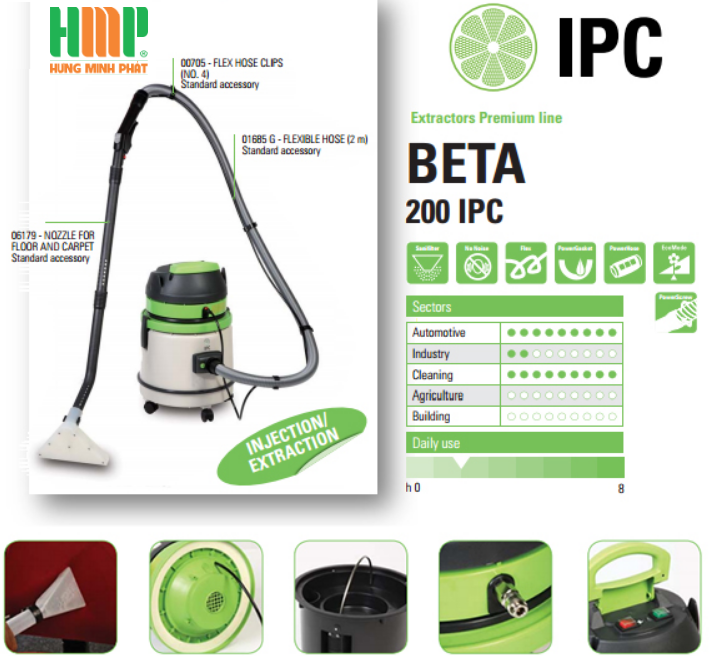 Máy hút bụi giặt thảm IPC BETA 200 VEI/G6 C/ACC là một máy giặt thảm công nghiệp với chức năng: hút bụi giặt thảm, giặt ghế sofa, ghế nỉ, làm sạch dân dụng, dọn nội thất xe… Làm sạch mọi bề mặt, mọi vết bẩn khi được dùng kết hợp với hóa chất làm sạch.Ứng dụng chủ yếu trong văn phòng, nhà hàng, khách sạn, làm nội thất xe, làm dịch vụ vệ sinh.