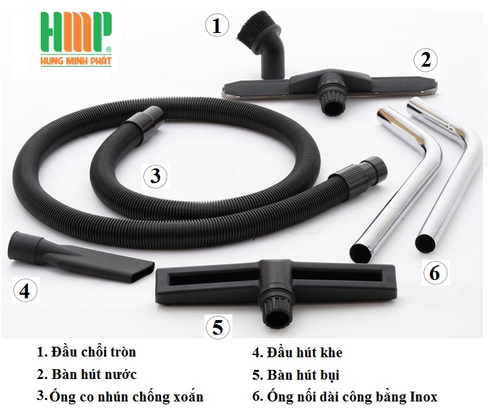 Phụ tùng bao gồm: bàn hút bụi, hút nước, đầu chổi tròn, đầu hút góc – hút khe rãnh