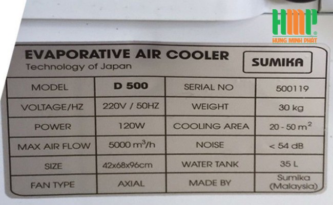 - SUMIKA D500 có công suất 120W và lưu lượng gió 5000m3/h bên cạnh đó thùng chứa 35 lít giúp chứa nước nhiều hơn để làm mát.