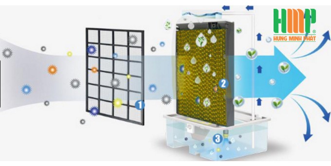 - Máy làm mát Cung cấp oxy: Ngoài chức năng làm mát khi hoạt động máy làm mát còn là hệ thống thông gió, luôn cung cấp một luồng khí tươi, sạch, mát lạnh, giàu oxy tạo sự sảng khoái cho không gian sử dụng, tạo sự chênh áp giữa môi trường trong và ngoài khu vực làm mát. Làm cho bụi bẩn không có cơ hội xâm nhập vào không gian sử dụng máy làm mát.