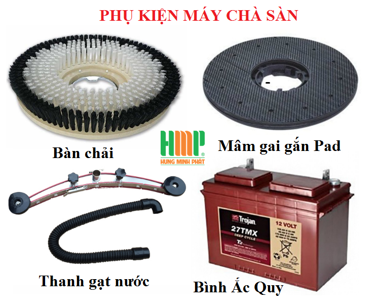 - Phụ tùng: Bàn chài chà sàn, mâm gắn pad, thanh gạt hút nước, 02 bình accquy, 01 sạc