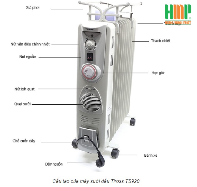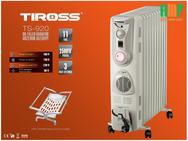 Thiết kế tiện lợi của máy sưởi dầu Tiross TS920: Tấm sưởi có chân đế bánh xe, chắc chắn và dễ di chuyển đến các vị trí khác nhau trong phòng. Dầu được đốt trong các ống kín, không tạo ra mùi khó chịu hay mùi khét như các loại máy sưởi khác. Bên cạnh chức năng sưởi ấm phòng trong mùa đông, chiếc máy sưởi dầu còn có thể làm nhiệm vụ của một chiếc máy sấy khô quần áo trong ngày thời tiết ẩm hay mưa, đem lại cảm giác thật thơm tho sạch sẽ cho quần áo của bạn.