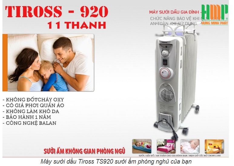 Máy sưởi dầu Tiross tốt cho sức khỏe, tiện lợi cho mẹ và bé: Nếu như các loại máy sưởi khác đốt nóng không khí xung quanh, làm nóng rất nhanh nhưng lại khiến cho da bạn bị rát và khô, máy sưởi dầu làm ấm nóng dần dần, bạn sẽ mất khoảng 15-20 phút để cảm nhận được hơi ấm lan tỏa xung quanh mình. Hơn thế nữa, máy có bộ phận điều chỉnh và cân đối nhiệt đảm bảo độ nóng vừa phải, đều đặn. Bởi thế máy sưởi dầu Tiross 11 thanh TS920 rất thích hợp cho các bà mẹ và bé
