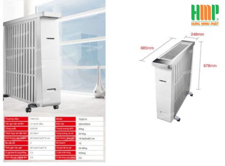 Công năng tuyệt vời từ máy sưởi dầu Tiross 13 thanh: Máy sưởi dầu TS9216 hiện đại cho bạn cảm giác ấm áp trong mùa đông mà không sợ bị khô da hay cảm giác ấm nóng lan tỏa không đều trên cơ thể. Không như các loại máy sưởi khác sử dụng sợi đốt hay đèn Halogen, máy sưởi dầu tỏa ra hơi ấm xuất phát từ lượng dầu có trong máy được đốt nóng.Chính vì thế, máy sưởi dầu được các bà mẹ mới sinh ưa chuộng nhất bởi ngoài chức năng sưởi ấm, máy sưởi dầu còn thay thế chiếc bàn là làm khô tã hay khăn của bé sơ sinh một cách nhanh chóng.
