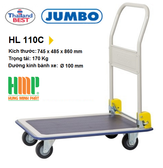 Xe đẩy hàng Jumbo HL 110C là sản phẩm thuộc thương hiệu nổi tiếng tại Thái Lan, sản xuất 100% theo dây chuyền và tiêu chuẩn Châu Âu. Được người dùng ưa chuộng bởi thiết kế thân thiện và dễ di chuyển. Kiểu dáng và mẫu mã đa dạng, gọn nhẹ, chắc chắn và an toàn. Xe đẩy chắc chắn, sử dụng bền lâu. Giúp vận chuyển hàng hoá lớn.